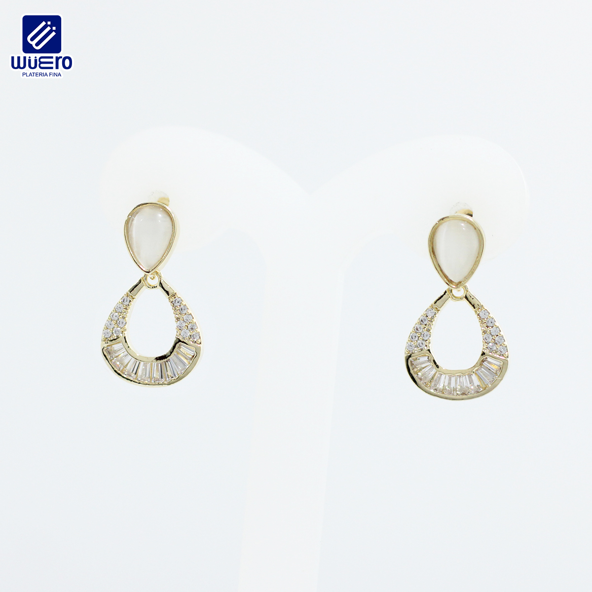 Fantasticos aretes realizados en oro laminado con piedra natural en forma oval e incrustaciones de zirconias en color blanco
